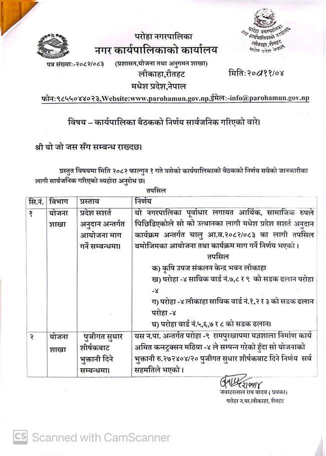 कार्यापालिका बैठकको निर्णय सार्वजनिक गरिएको सम्बन्धमा ।