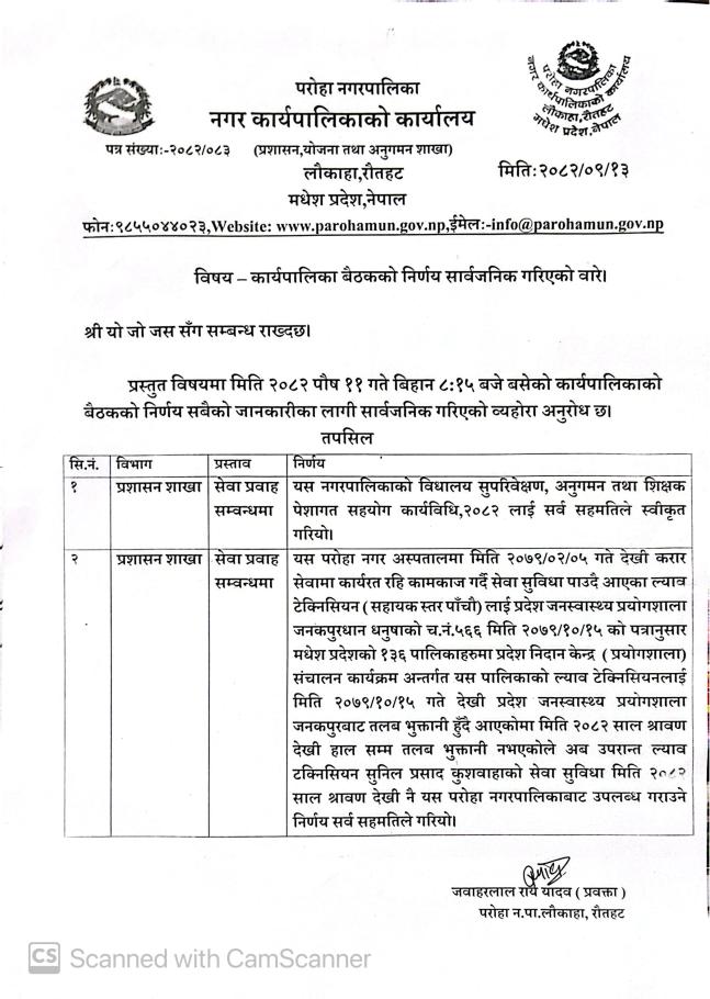 कार्यपालिका बैठक पौष महिनाको सार्वजनिक गरिएको सम्बन्धमा सूचना ।