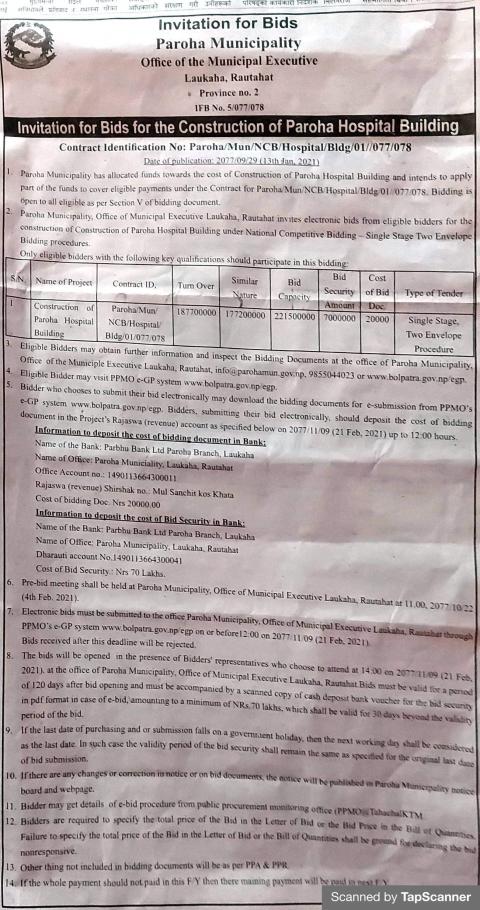 परोहा अस्पताल भवन निर्माणको लागि बोलपत्र आह्वान।