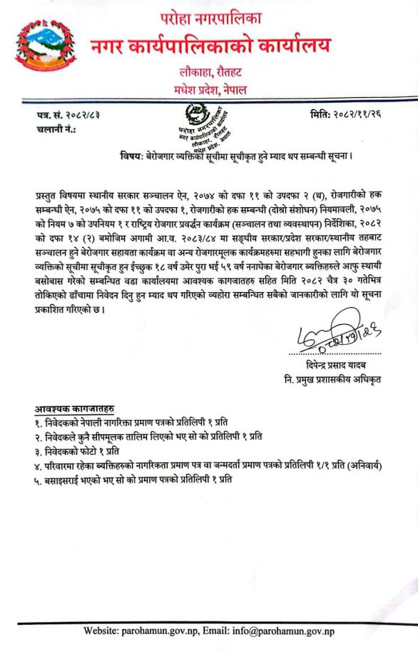 बेरोजगार व्यक्तिको सूचीमा सूचीकृत हुने म्याद थप सम्बन्धमा सूचना ।